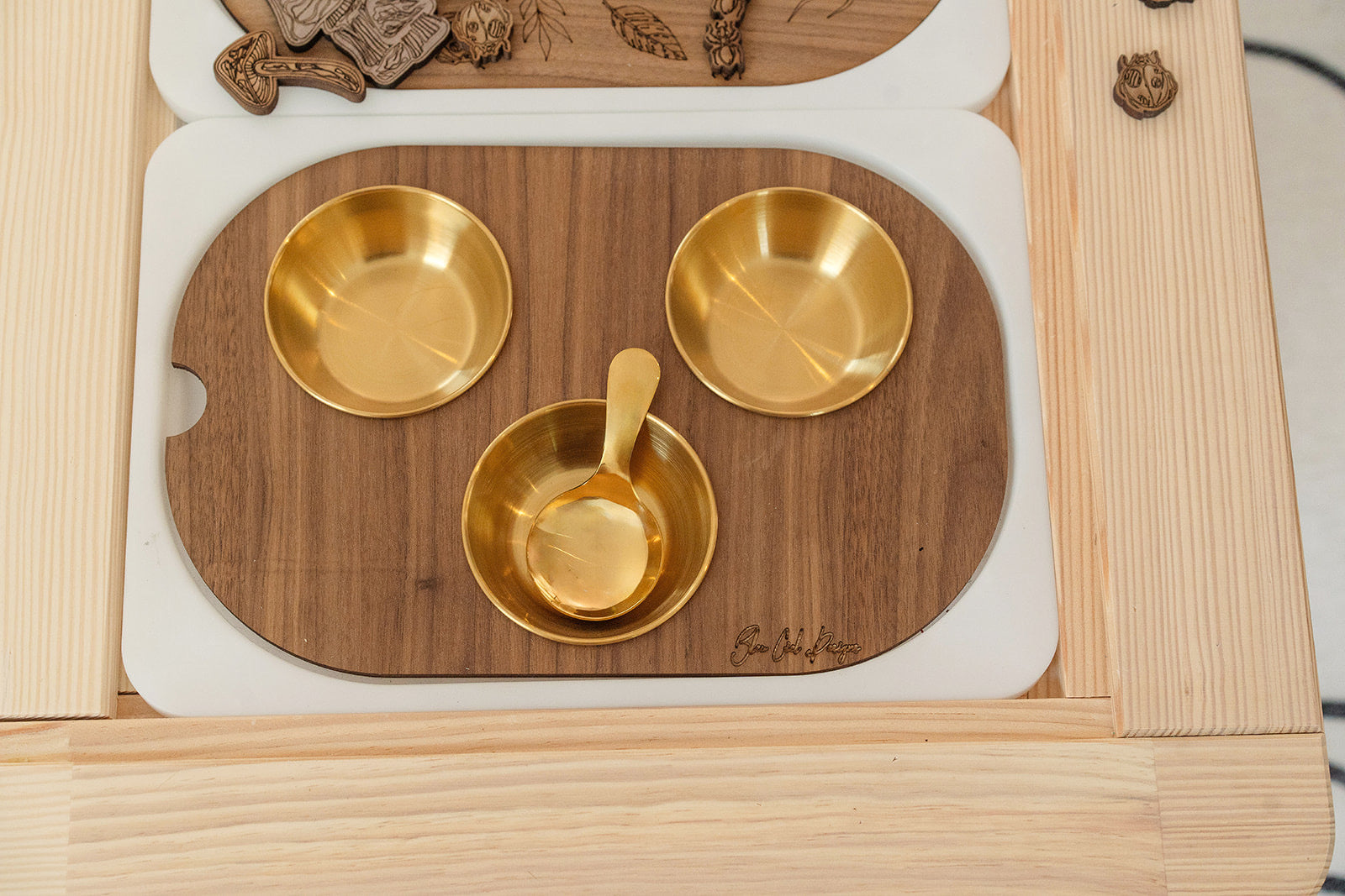 Comes with 3 stainless steel (gold color) bowls and one matching small scoop. Bowls are dishwasher safe and food grade.