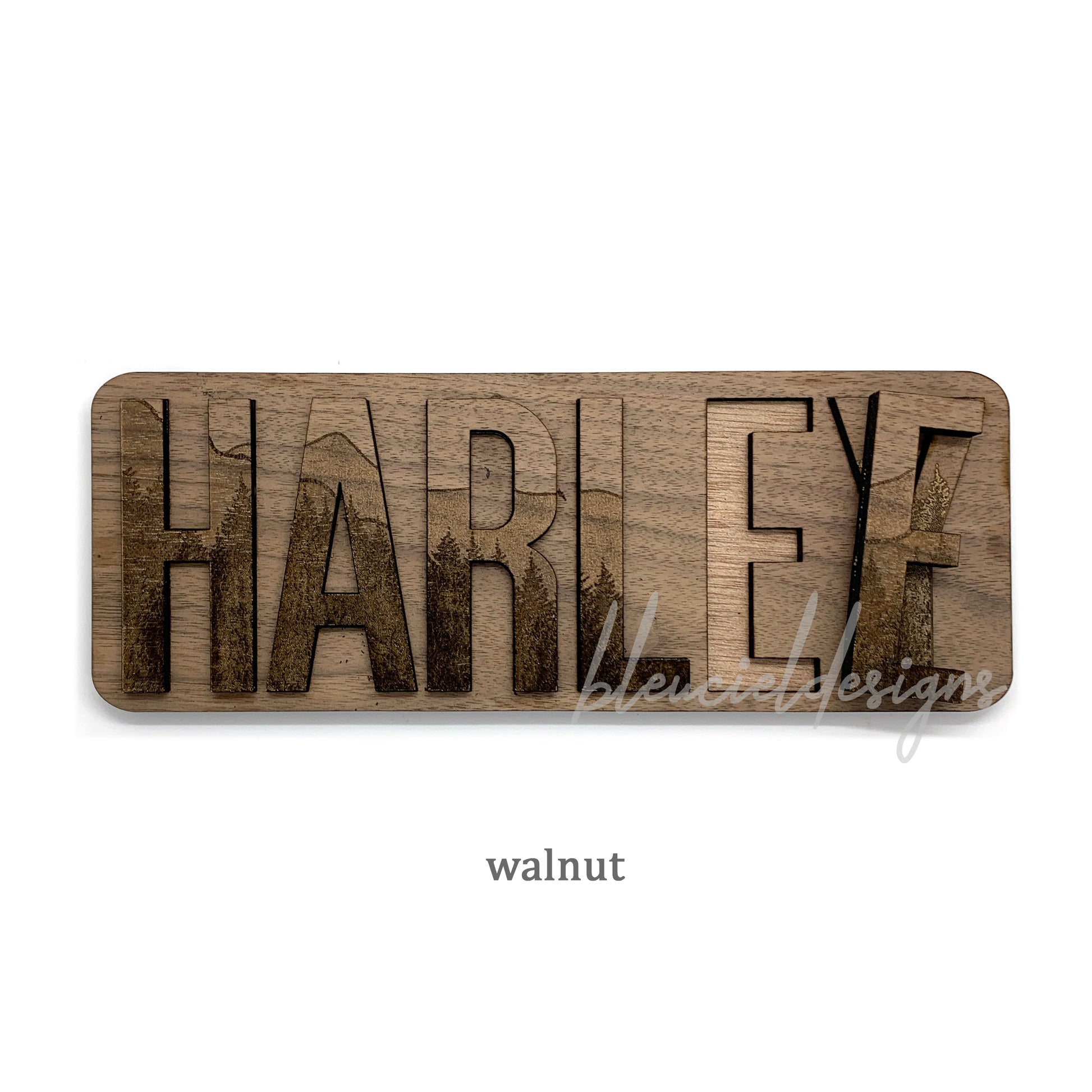 Our mountain name block features a mesmerizing engraving of mountains and forests over the letters.