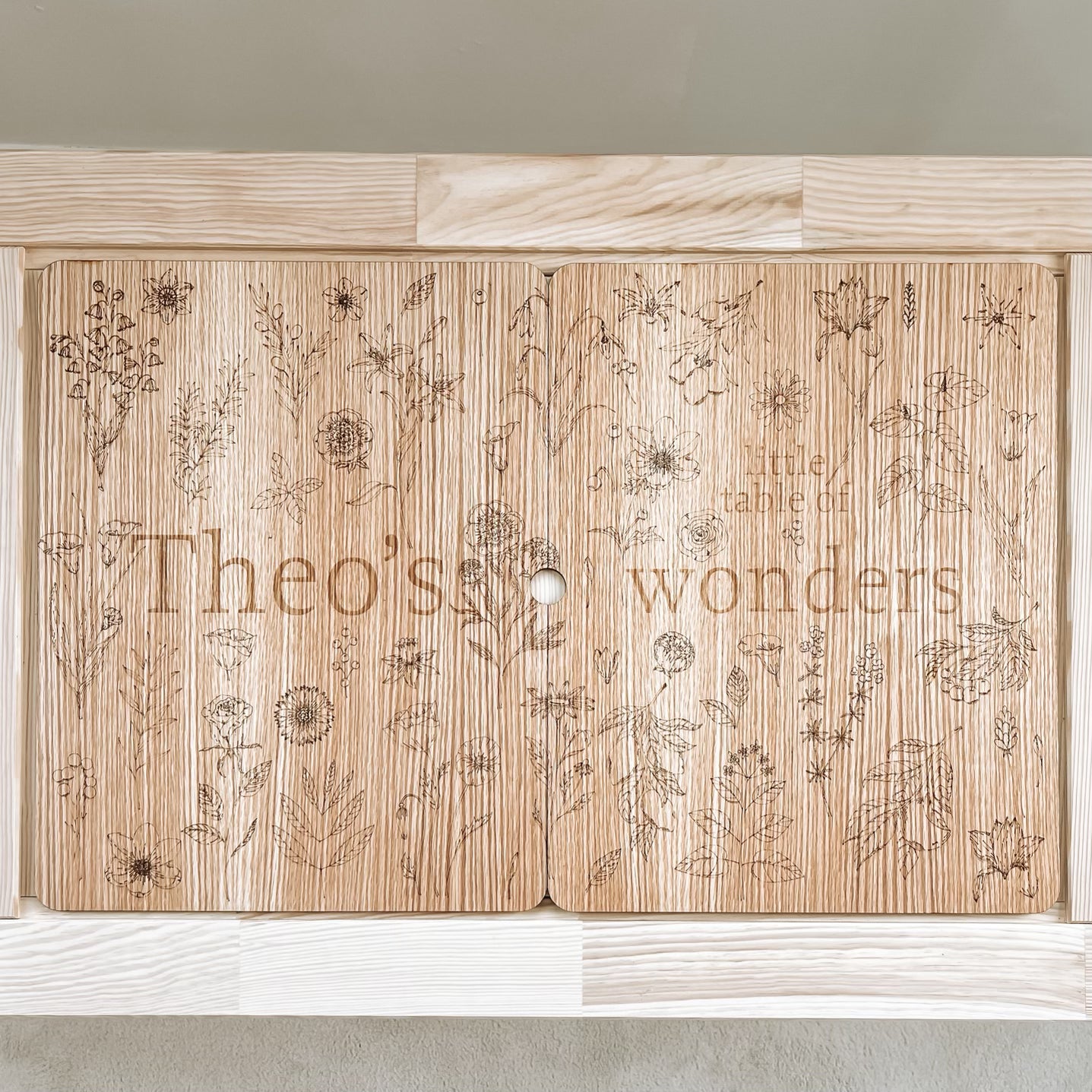 Made with two layers of premium walnut or oak veneered plywood — your choice! This heirloom-quality piece is laser-cut and laser-engraved. It's treated with food-safe oil to handle any mess your little one can throw at it and can handle rough play. This lid fits standard IKEA Trofast bins.
