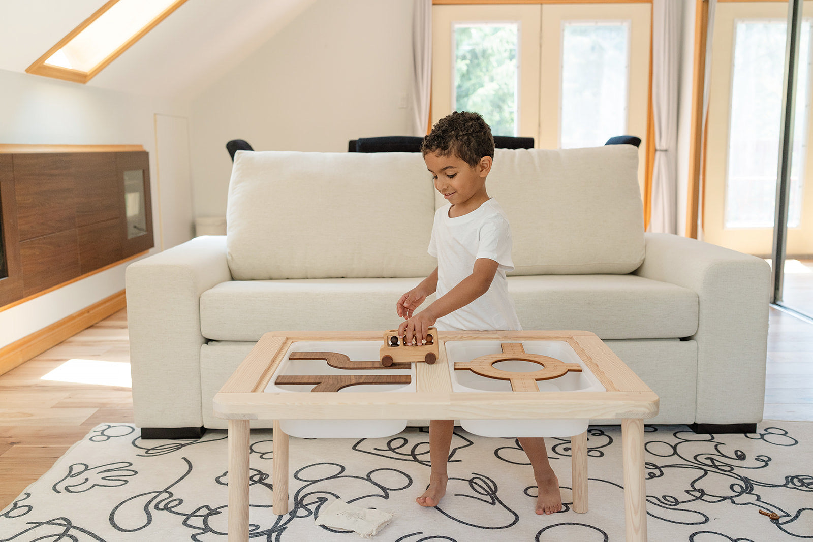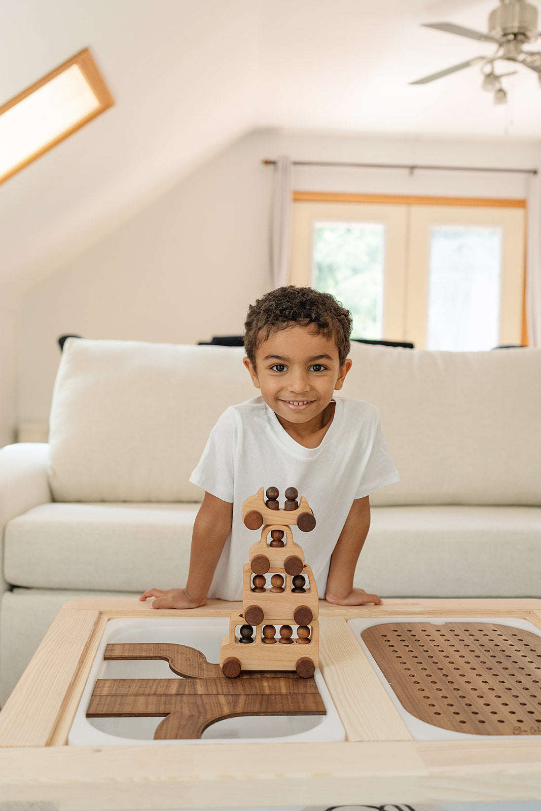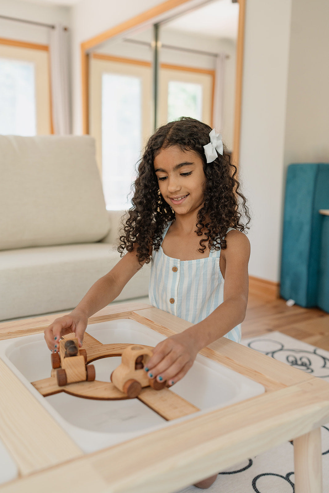 Made of durable balsa wood, these vehicles are the same width as our modular road set sized to fit trofast bins in the Flisat table . The peg people inside are removeable,